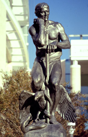 Power & Wisdom: A female figure representing the contemplative aspect of the law and a male figure representing the coercive aspect are located on either side of the entry stairs to the Ronald Reagan Courthouse in Santa Ana, California.